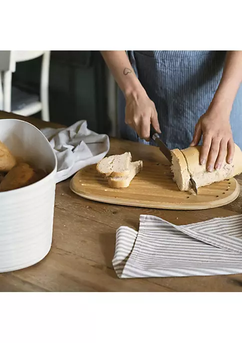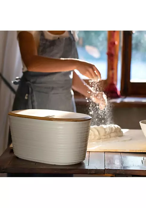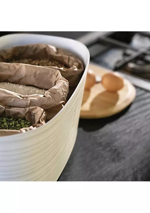 Bread bin made by recycling twenty-seven 100% post-consumer disposable water bottles. With bamboo wood top. Particularly versatile, it is also an excellent kitchen organizer.