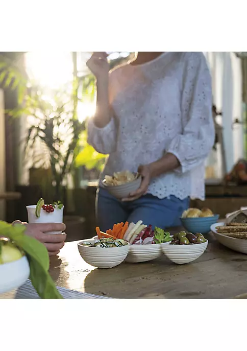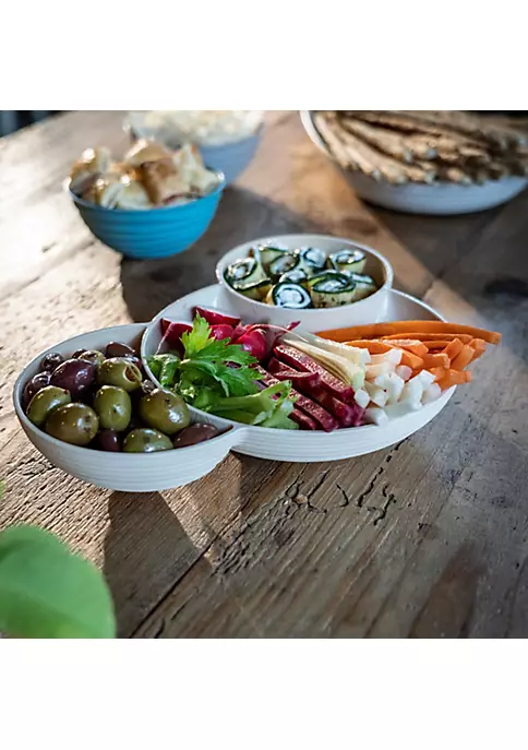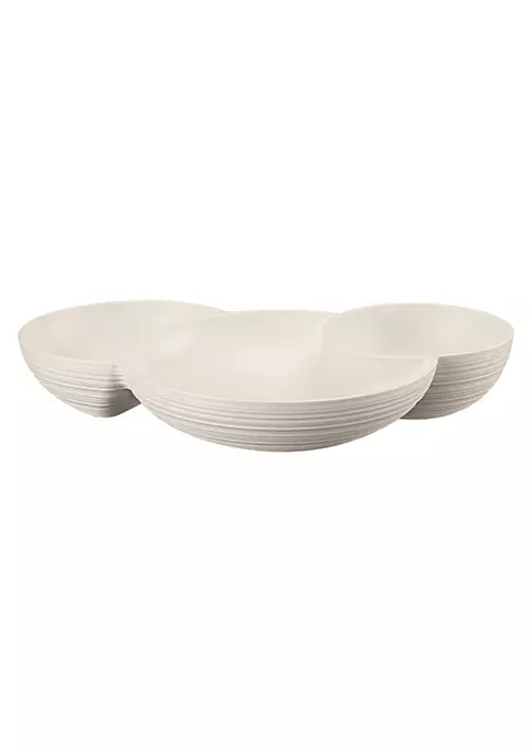 The hors d’oeuvres dish is subdivided into three sections, to accommodate anything from peanuts to olives, fresh vegetable sticks or delicious cheese cubes. With attractive, curvy shapes, it is guaranteed convenient. Made by recycling eight 100% post-consumer disposable water bottles.