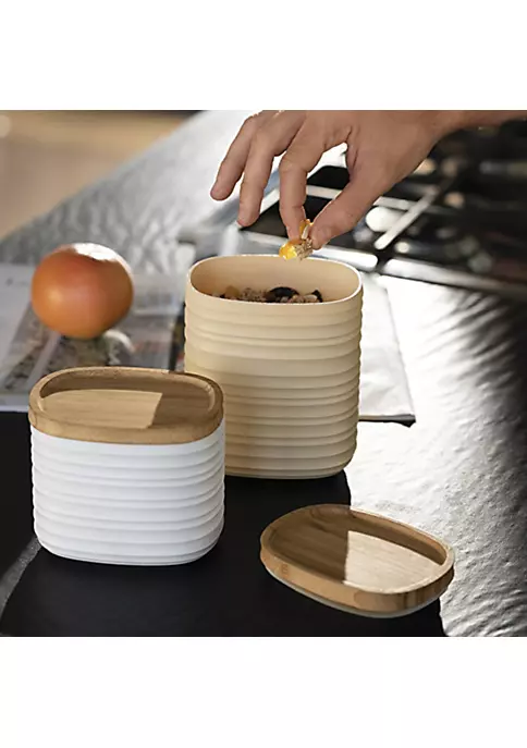 An ideal storage jar not only for sugar or salt but also for spices or coffee. Made by recycling six 100% post-consumer disposable water bottles. With stay-fresh bamboo wood lid. Capacity 1000cc.