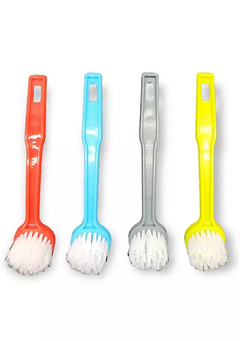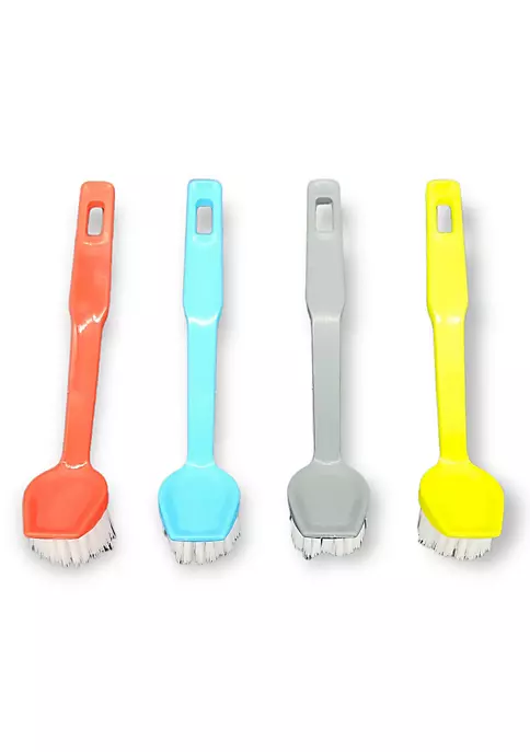 Features strong bristles for srubbing and a scraper built into the head to help scrap off stuck on food and other debris. The durable plastic handle includes a hanging hole for convenient storage.